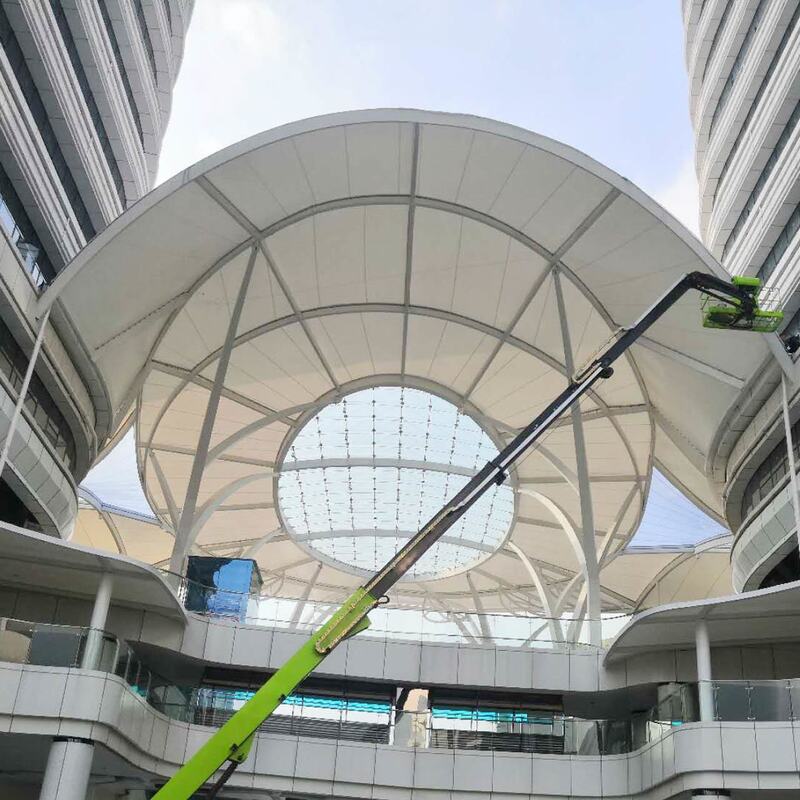 This PVDF building membrane has standard thicknesses 1.0mm to 1.03mm, widths 1000mm to 1800mm and lengths 50m 100m. Customizable colors are offered. It boasts excellent weather UV resistance self cleaning high strength flame retardancy and heat insulation, and is workable for stadium roof wall and tension membrane structure.